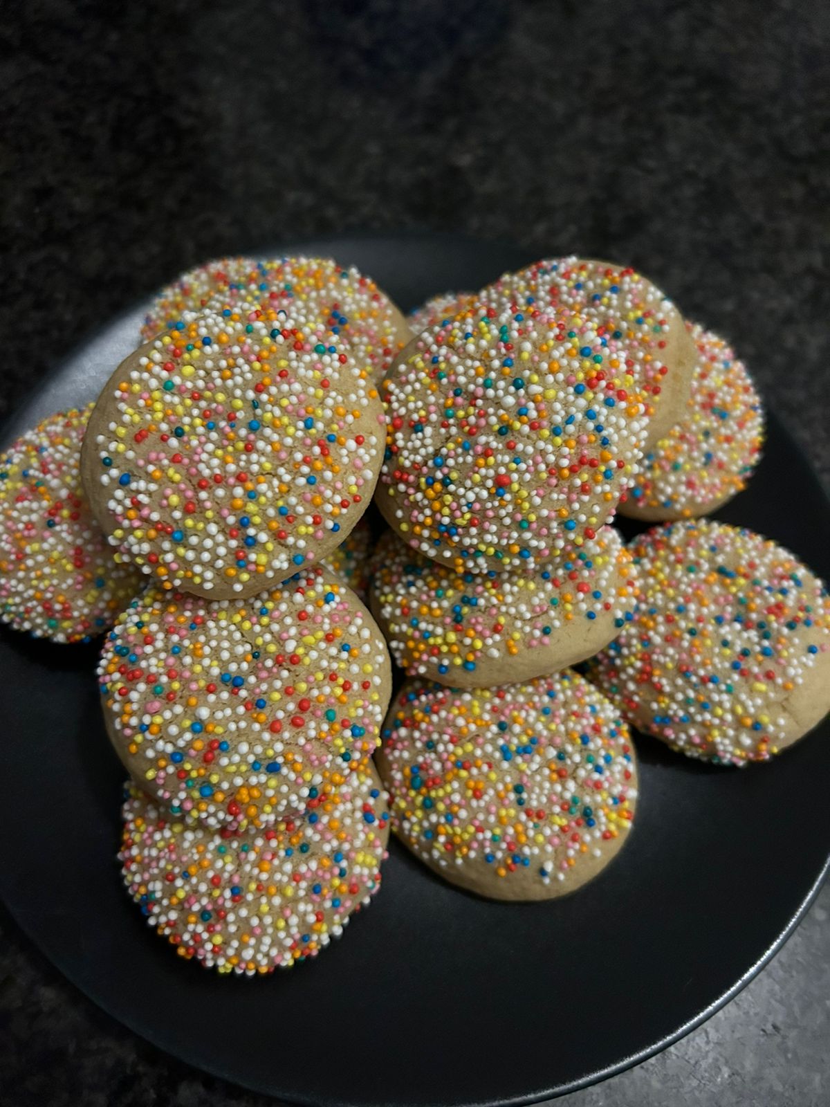 Pour your sprinkles into a separate shallow bowl so it’s easier for your Mini Bakers to get messy. Roll the cookie ball into the sprinkles so there’s a nice even coat on the top.